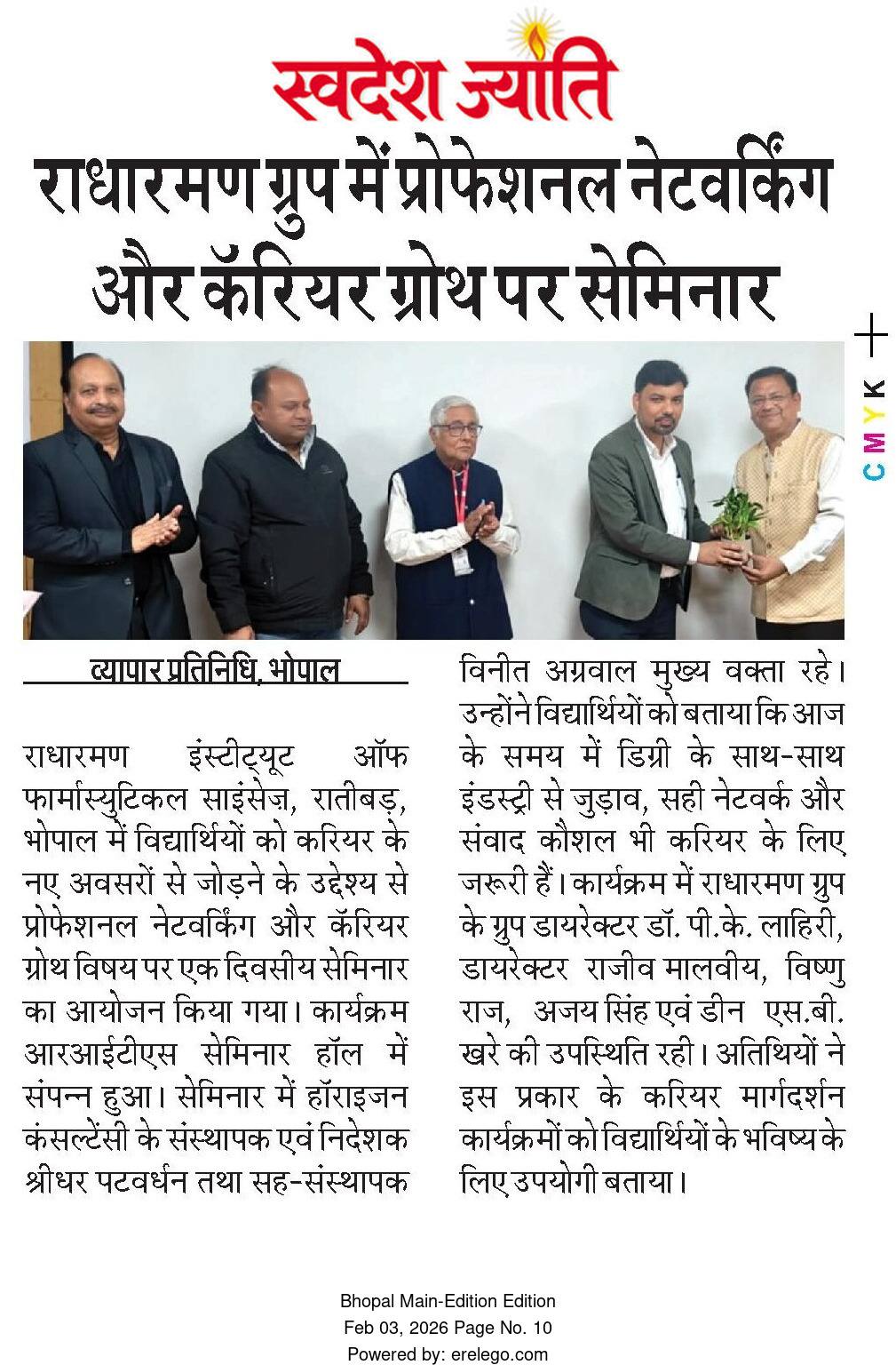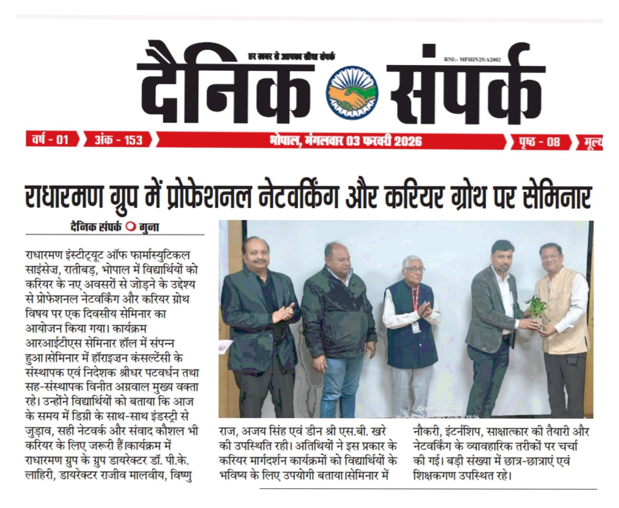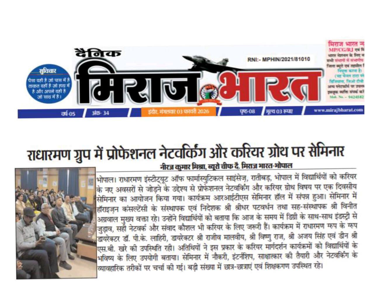 राधारमण इंस्टीट्यूट ऑफ फार्मास्युटिकल साइंसेज़, रातीबड़, भोपाल में विद्यार्थियों को करियर के नए अवसरों से जोड़ने के उद्देश्य से प्रोफेशनल नेटवर्किंग और करियर ग्रोथ विषय पर एक दिवसीय सेमिनार का आयोजन किया गया। कार्यक्रम आरआईटीएस सेमिनार हॉल में संपन्न हुआ। सेमिनार में हॉराइज़न कंसल्टेंसी के संस्थापक एवं निदेशक श्री श्रीधर पटवर्धन तथा सह-संस्थापक श्री विनीत अग्रवाल मुख्य वक्ता रहे। उन्होंने विद्यार्थियों को बताया कि आज के समय में डिग्री के साथ-साथ इंडस्ट्री से जुड़ाव, सही नेटवर्क और संवाद कौशल भी करियर के लिए जरूरी हैं। कार्यक्रम में राधारमण ग्रुप के ग्रुप डायरेक्टर डॉ. पी.के. लाहिरी, डायरेक्टर श्री राजीव मालवीय, श्री विष्णु राज, श्री अजय सिंह एवं डीन श्री एस.बी. खरे की उपस्थिति रही। अतिथियों ने इस प्रकार के करियर मार्गदर्शन कार्यक्रमों को विद्यार्थियों के भविष्य के लिए उपयोगी बताया। सेमिनार में नौकरी, इंटर्नशिप, साक्षात्कार की तैयारी और नेटवर्किंग के व्यावहारिक तरीकों पर चर्चा की गई। बड़ी संख्या में छात्र-छात्राएं एवं शिक्षकगण उपस्थित रहे।