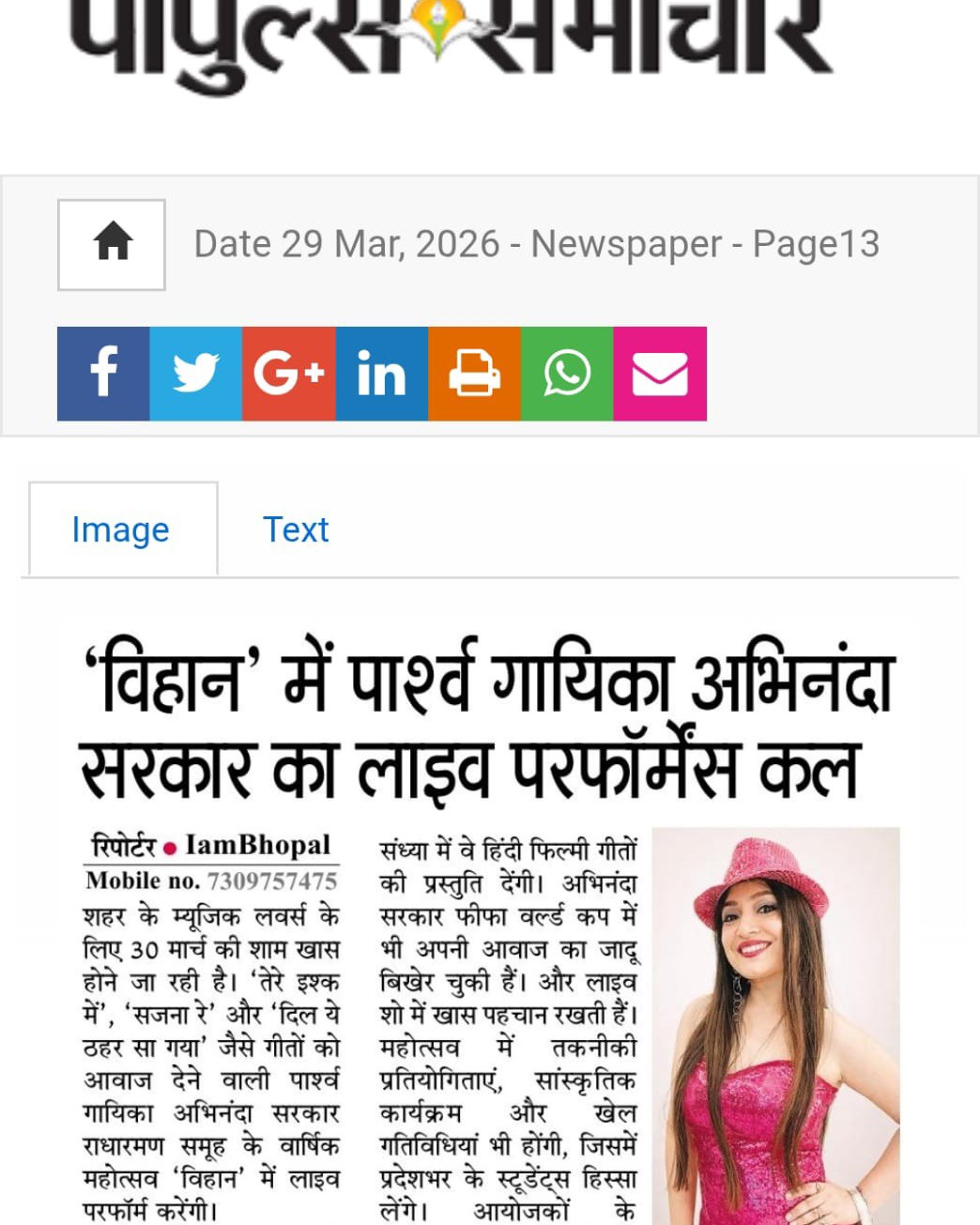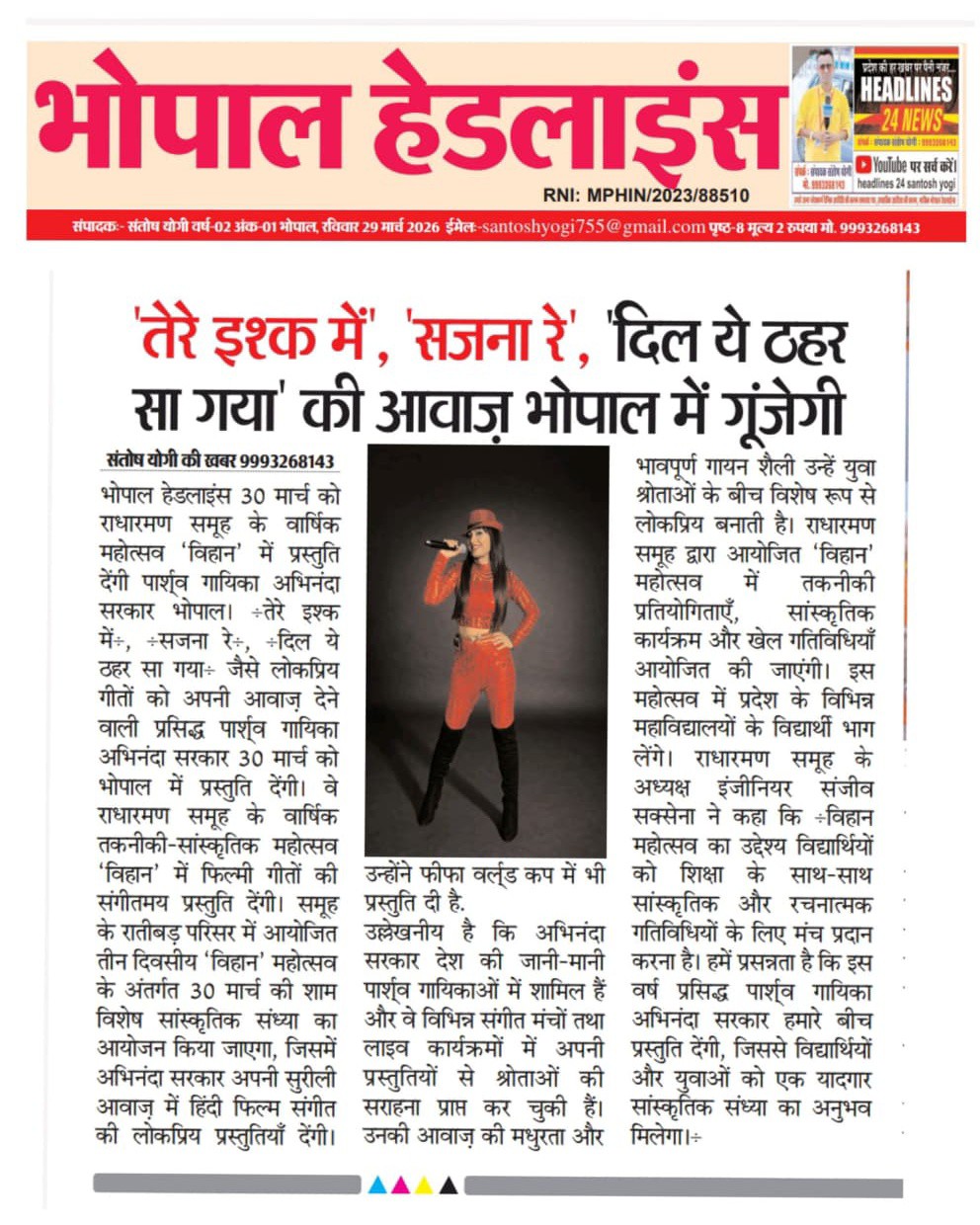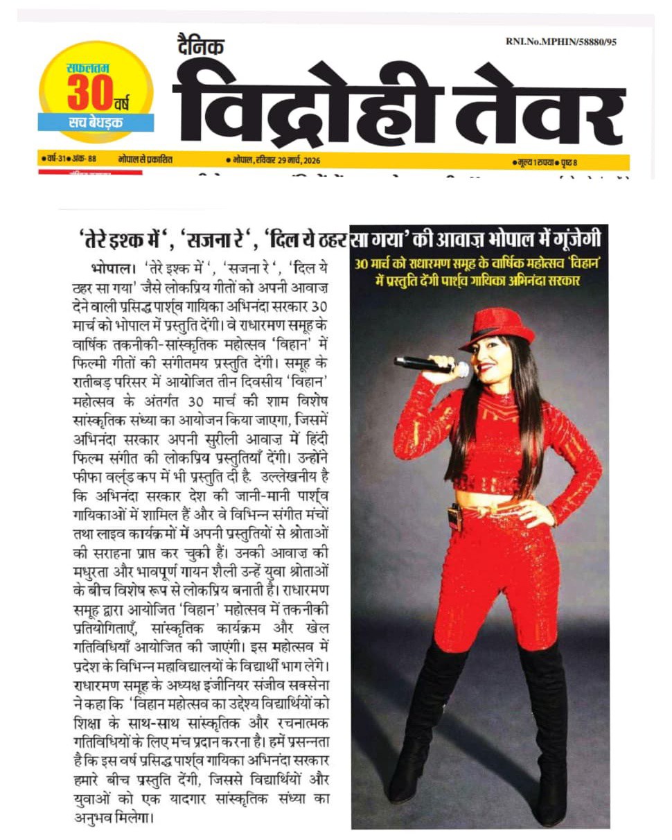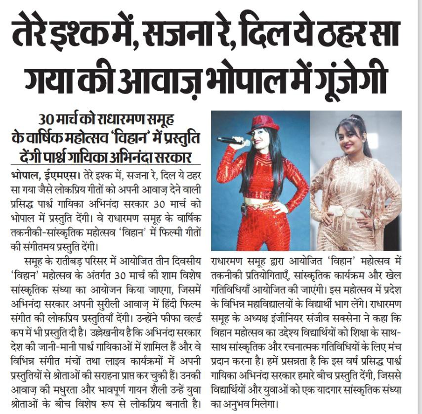 तेरे इश्क में”, “सजना रे”, “दिल ये ठहर सा गया” की आवाज़ भोपाल में गूंजेगी 30 मार्च को राधारमण समूह के वार्षिक महोत्सव ‘विहान’ में प्रस्तुति देंगी पार्श्व गायिका अभिनंदा सरकार