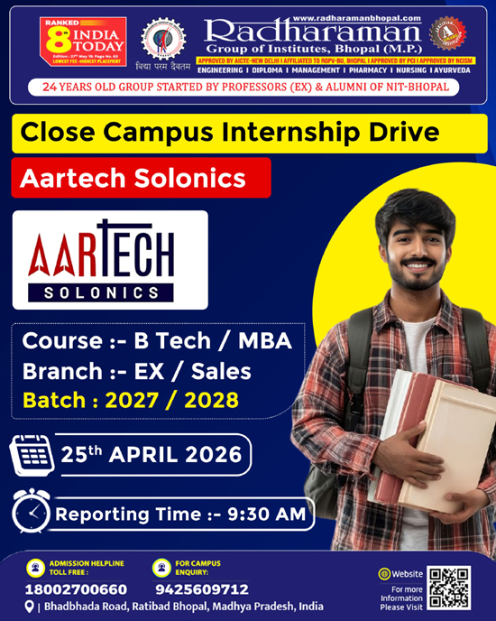 The success story of Radharaman Group of Institutes begins in the year 2003 when the Typasya Education Society launched its first technical institute Radhraman Institute of Technology & Science (Approved by AICTE, New Delhi & Affiliated to Rajiv Gandhi Proudyogiki Vishwavidhyalaya (RGPV) Bhopal). Presently the institute is running programs offering MBA, M.Tech, M.Pharm, BE, B. Pharm degrees.. .