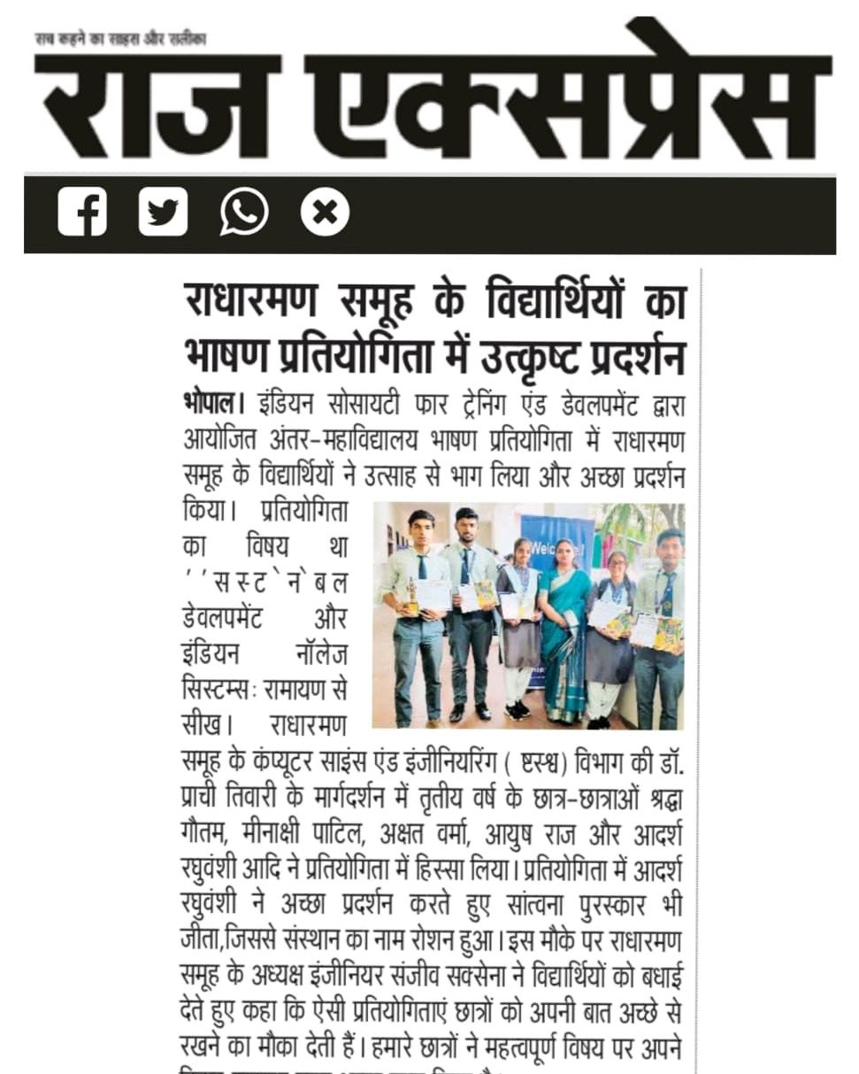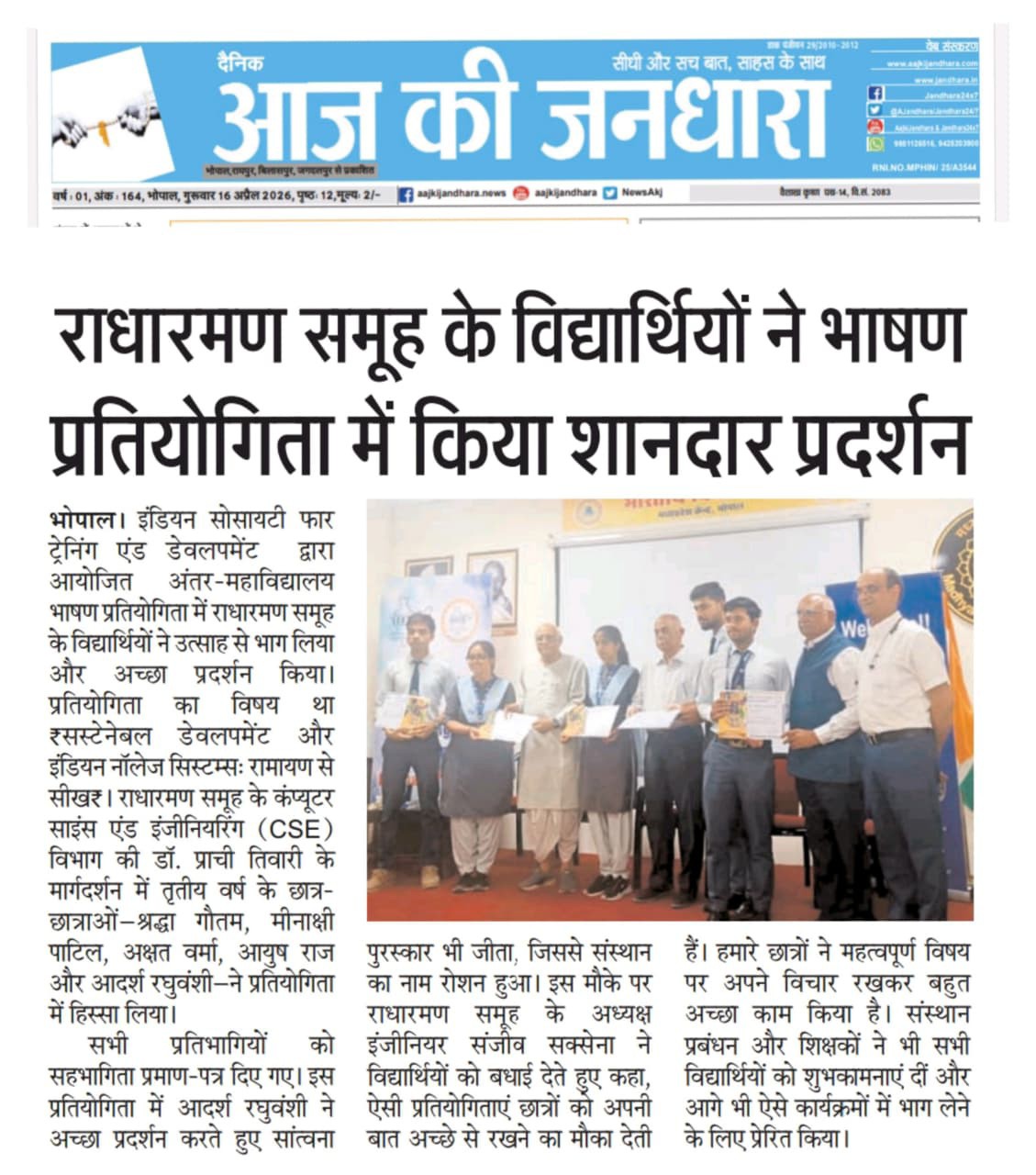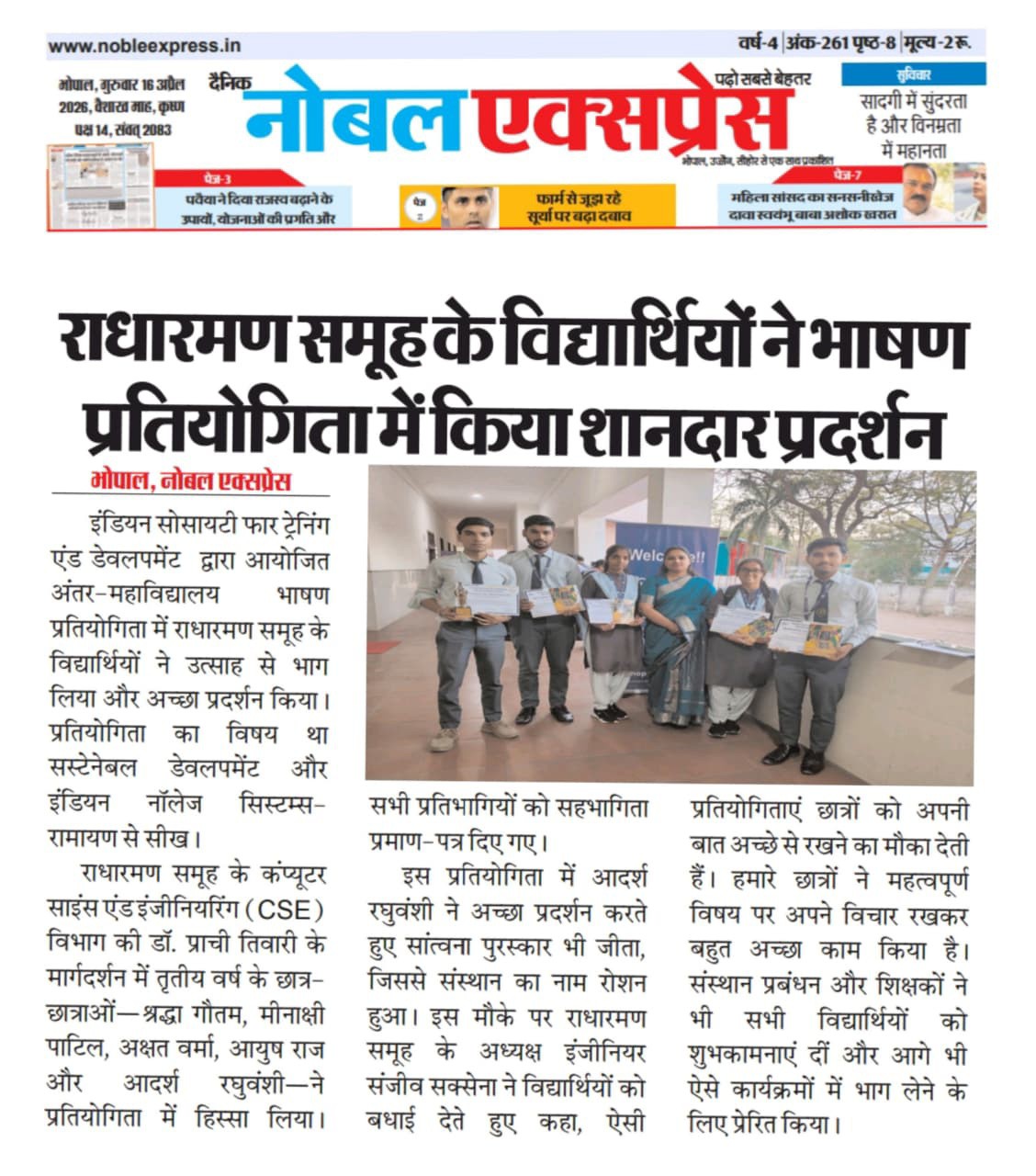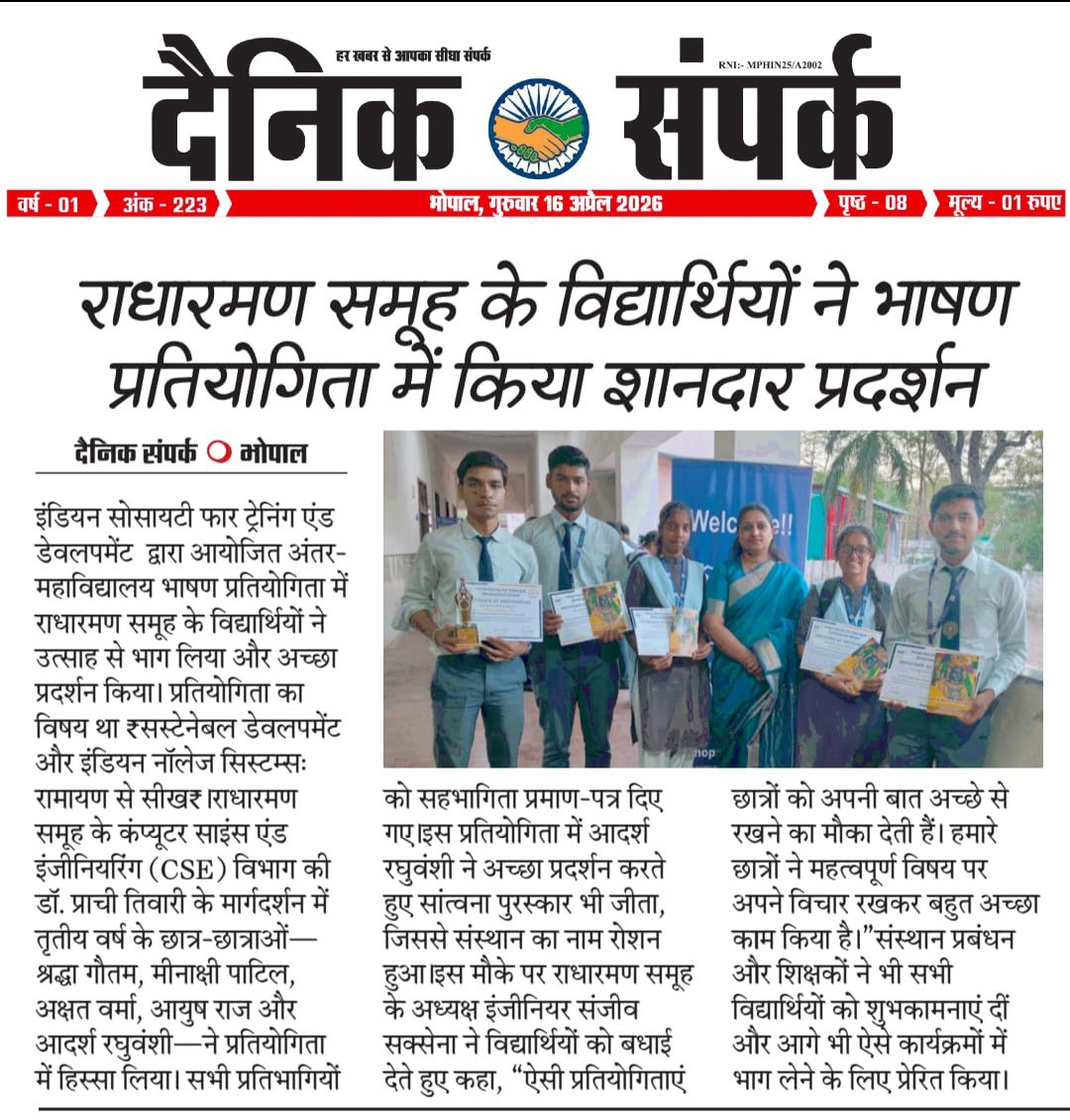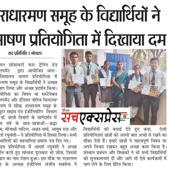 Students of Radharaman group participated in the Inter-College Speech Competition organized by Indian Society for Training and Development and performed greatly. The theme of this competition was — Sustainable Development and Indian Knowledge Systems: Insights from Ramayan. Dr. of Computer Science and Engineering (CSE) department Third year students—Shraddha Gautam, Meenakshi Patil, Akshat Verma, Ayush Raj and Adarsh Raghuvanshi— participated in the competition under the guidance of Prachi Tiwari. Certificates were also given to all participants. In this competition, Adarsh Raghuvanshi won consolation prize by giving excellent speech and made Radharaman group proud. On the occasion, Radharaman Group President Engineer Sanjeev Saxena congratulated the students that such competitions help a lot in improving the confidence and thinking of the students. Also, students gave a good message with their views on important topics like Indian knowledge and sustainable development.