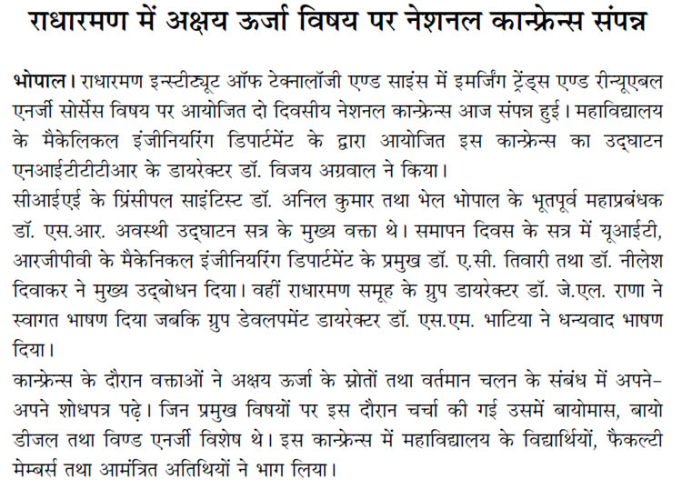 Title : A National Conference on Emerging Trends and Renewable Energy Sources (NCETRES-2013) was organized by Mechanical Department of Radharaman Institute of Technology and Science Details : A National Conference on Emerging Trends and Renewable Energy Sources (NCETRES-2013) was organized by Mechanical Department of Radharaman Institute of Technology and Science on 29th and 30th of April 2013. The Program was Inaugurated by Dr. Vijay Agrawal (Director,NITTTR) and he also share his thoughts on Energy Management.