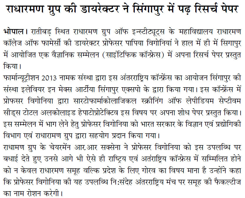 DR. PAPIYA BIGONIYA, PRESENTED A SCIENTIFIC RESEARCH PAPER IN 2ND INTERNATIONAL CONFERENCE ON PHARMA-NUTRITION 2013 ORGANIZED BY ELSEVIER IN MAX ATRIA SINGAPORE EXPO, SINGAPORE - 03-05-2013 ![]() DR. PAPIYA BIGONIYA, PRESENTED A SCIENTIFIC RESEARCH PAPER IN 2ND INTERNATIONAL CONFERENCE ON PHARMA-NUTRITION 2013 ORGANIZED BY ELSEVIER IN MAX ATRIA SINGAPORE EXPO, SINGAPORE - 03-05-2013 ![]() |
