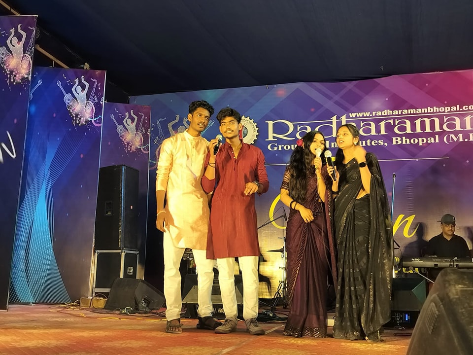 Title : राधारमण ग्रुप आफ इन्सटीट्युशंस के वार्षिक उत्सव विहान में हुए सिंगिंग कॉम्पिटिशनDetails : राधारमण ग्रुप आफ इन्सटीट्युशंस के वार्षिक उत्सव विहान में हुए सिंगिंग कॉम्पिटिशन में एक से बढ़कर एक धमाकेदार प्रस्तुतियां स्टूडेंट्स के द्वारा दी गयीं जिसमें आयुर्वेद के प्रथम वर्ष की छात्रा ने सोलो सांग फीमेल कैटेगरी में शिवी दीक्षित विजेता रहीं और कृष्णाली उपविजेता रहीं, डुएट सोंग में भी आयुर्वेद कॉलेज की शिवी दीक्षित ने सहपाठी सिद्धेश पाटिल के साथ मिलकर धूम मचाई और प्रथम स्थान प्राप्त किया एवं फार्मेसी कॉलेज के शादाब खान और ऋषि साहू द्वितीय स्थान पर रहे । मेल कैटेगरी सोलो सोंग में फार्मेसी कॉलेज के छात्र देवेन ने प्रथम तथा ऋषि ने द्वितीय स्थान प्राप्त किया ।