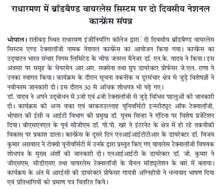 Title : NATIONAL CONFERENCE ON BROADBAND WIRELESS SYSTEM AND TECHNOLOGIESDetails : TWO DAYS NATIONAL CONFERENCE ON BROADBAND WIRELESS SYSTEM AND TECHNOLOGIES HELD IN RADHARAMAN GROUP OF INSTITUTES,BHOPAL.