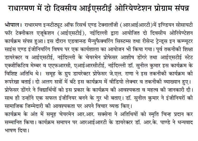 Details : ISTE Orientation -cum two days Departmental Workshop@Radharaman Group of institutes Bhopal
