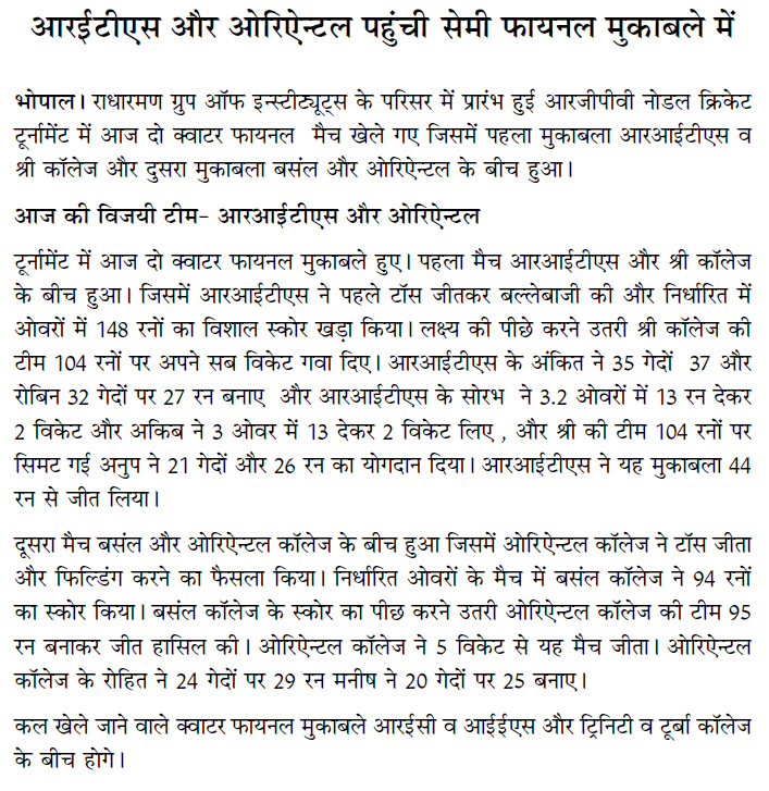 Title : Nodal Cricket Tournament :RITS & ORIENTAL College in SemifinalDetails : RITS WON BY 44 RUNS