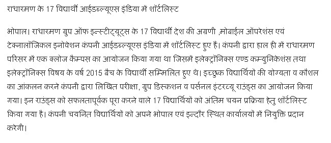 Title : 17 students shortlisted in IWS INDIA close campus drive at Radharaman,BhopalDetails : 17 students shortlisted in IWS INDIA close campus drive at Radharaman,Bhopal.