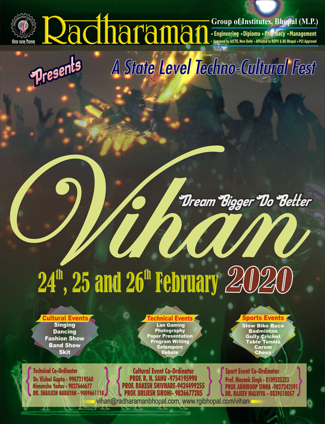 Title : Radharaman presents VIHAN on 24 , 25 & 26 of FebruaryDetails : Radharaman presents VIHAN on 24 , 25 & 26 of February.It is A State Level Techno Cultural Fest.
