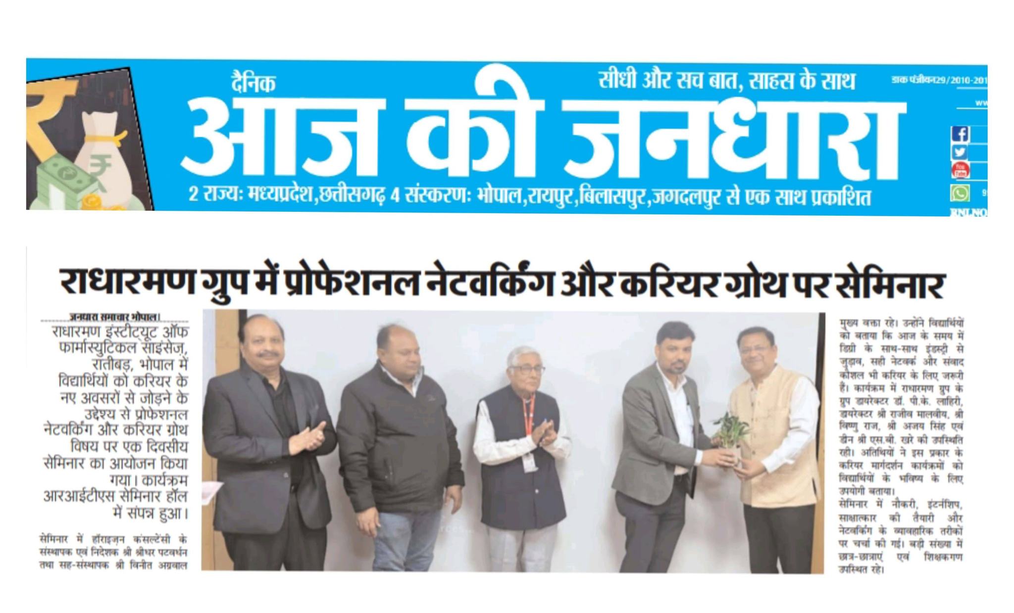 Title : राधारमण ग्रुप में प्रोफेशनल नेटवर्किंग और करियर ग्रोथ पर सेमिनारDetails : राधारमण इंस्टीट्यूट ऑफ फार्मास्युटिकल साइंसेज़, रातीबड़, भोपाल में विद्यार्थियों को करियर के नए अवसरों से जोड़ने के उद्देश्य से प्रोफेशनल नेटवर्किंग और करियर ग्रोथ विषय पर एक दिवसीय सेमिनार का आयोजन किया गया। कार्यक्रम आरआईटीएस सेमिनार हॉल में संपन्न हुआ।